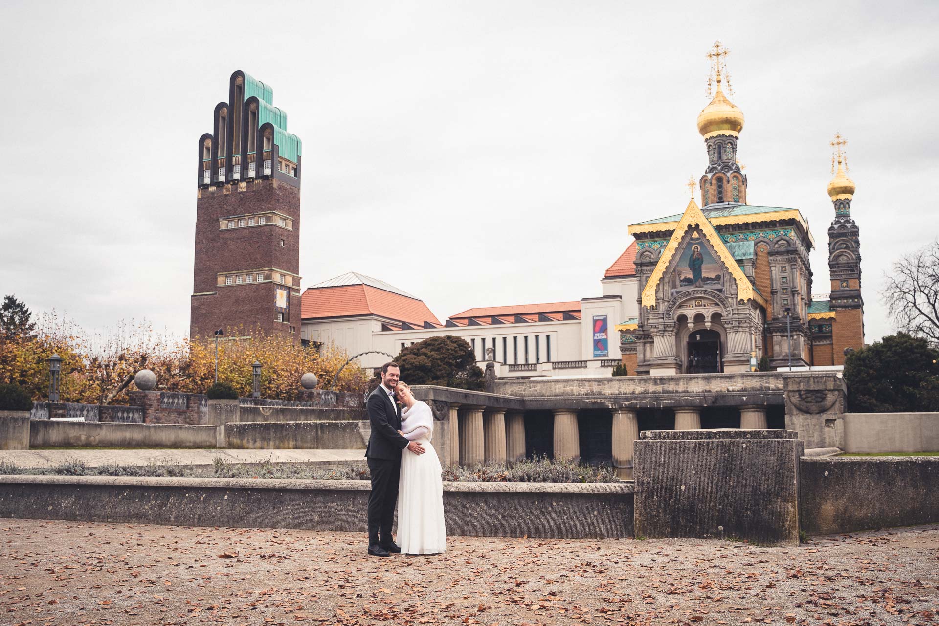 Nehmen wir zum Beispiel den Hochzeitsturm auf der Mathildenhöhe, oft liebevoll Fünffingerturm genannt. Er ist das absolute Wahrzeichen der Stadt und Teil des berühmten UNESCO Welterbe. Die Atmosphäre hier oben ist wirklich einmalig. Eure Trauung findet im prunkvollen Zimmer der Großherzogin statt. Es ist ein ganz besonderes Gefühl, sich in solch einer geschichtsträchtigen und gleichzeitig romantischen Kulisse das Jawort zu geben.
