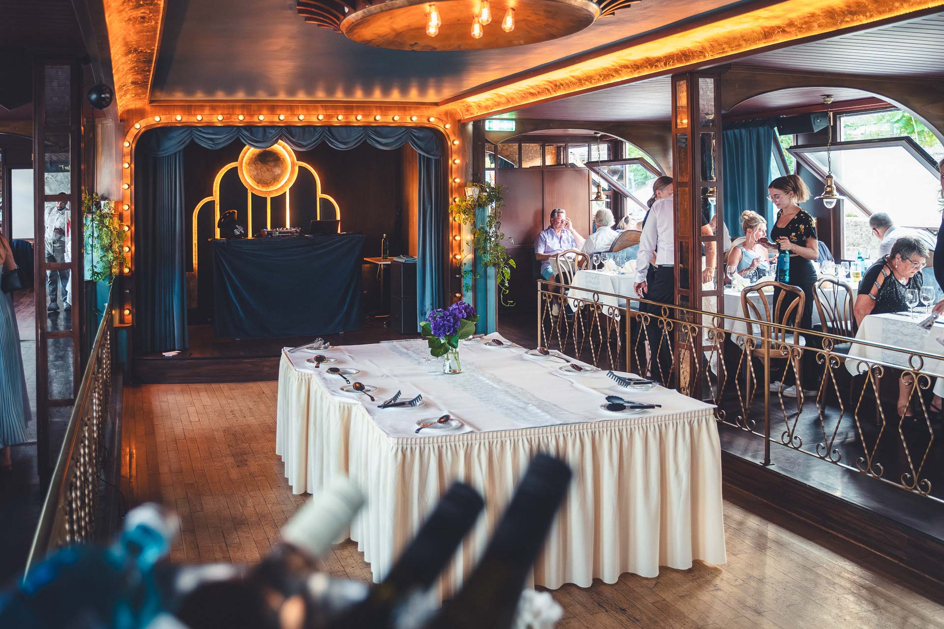 Nach dem Sektempfang an der frischen Luft verlagern wir uns meist ins Schiffsinnere. Hier erwartet euch kein 08/15-Buffet, sondern oft ein gehobenes 4-Gänge-Menü. Und natürlich darf auch der Anschnitt der Hochzeitstorte nicht fehlen – ob oben an Deck oder unten im Restaurant, das entscheiden wir spontan. Wenn dann später die Party startet und die Tanzfläche eröffnet wird, bin ich in meinem Element. Viele fürchten, dass es im Schiff zu dunkel für Fotos ist, aber ich sehe das anders: Mit der richtigen Technik fange ich genau diese gemütliche, ausgelassene Lichtstimmung ein, ohne die Atmosphäre „totzublitzen“.