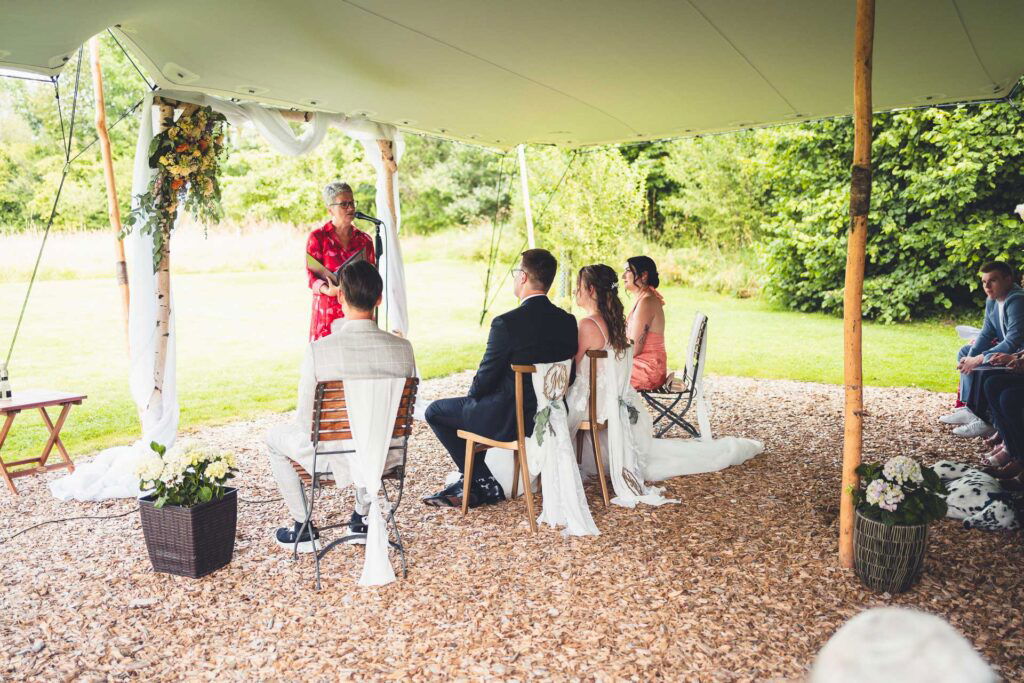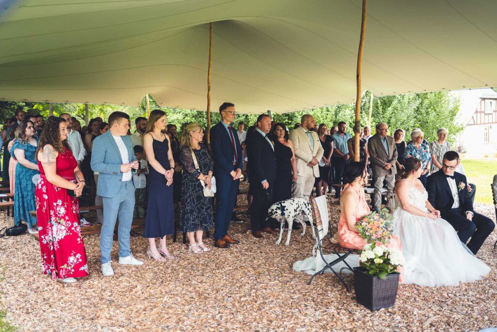 Mit einer großen Wiese und einem sehr schönen Zelt, welches dort aufgebaut ist bietet sich diese Location perfekt für eine freie Trauung an. Jeder kann gemütlich im Schatten sitzen während vorne das Pärchen sich die wahrscheinlichsten schönsten Worte ihres Lebens anhören dürfen. Nicht nur für mich als Hochzeitsfotograf ein absoluter Traum. Auch danach wird mit einem Sektempfang und Snacks so wie Flammkuchen für eine schöne und entspannte Atmosphäre direkt neben dem dazugehören Teich gesorgt.