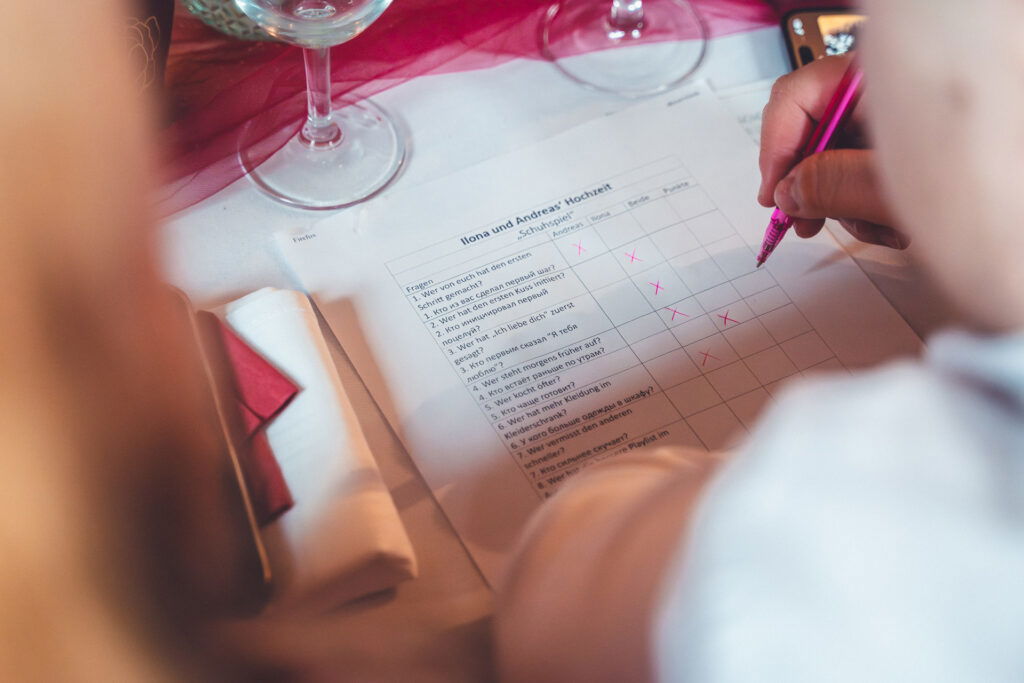 Beim Hochzeitsbingo bekommt jeder Gast eine Karte mit verschiedenen lustigen Aufgaben oder Aussagen wie „Finde jemanden, der ein Instrument spielt“ oder „Mache ein Foto mit einem Gast, der über 50 Kilometer gereist ist“. So kommt jeder schnell ins Gespräch und lustige Begegnungen sind garantiert.