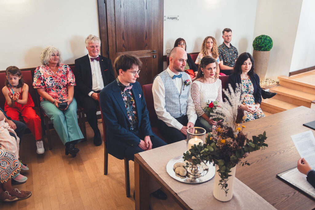 Eine standesamtliche Trauung dauert in der Regel zwischen 20 und 30 Minuten. Plant zusätzlich Zeit für Gratulationen und Fotos ein.